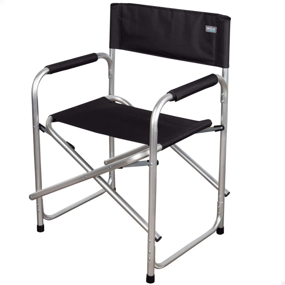 Silla tipo director plegable Aktive Beach de 51 x 45 x 81 cm. El asiento mide 45 cm de alto y la distancia entre reposabrazos es de 56 cm de ancho. Asiento de material Oxford negro. Cuenta con almohadilla protectora en los reposabrazos y estructura de aluminio con tubos de 2 cm de grosor. Patas con tacos antideslizantes de goma para mayor estabilidad. Soporta hasta 100 kg. Ideal para playa, camping o asiento extra.