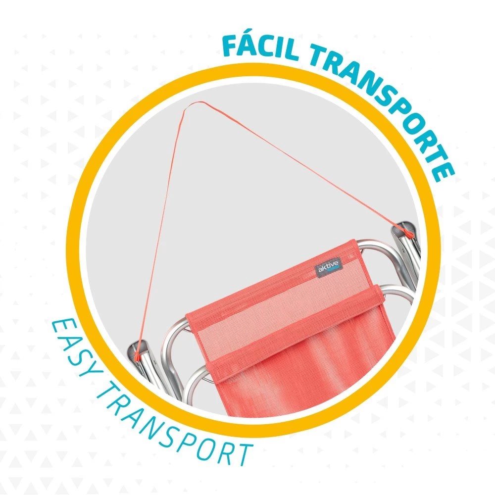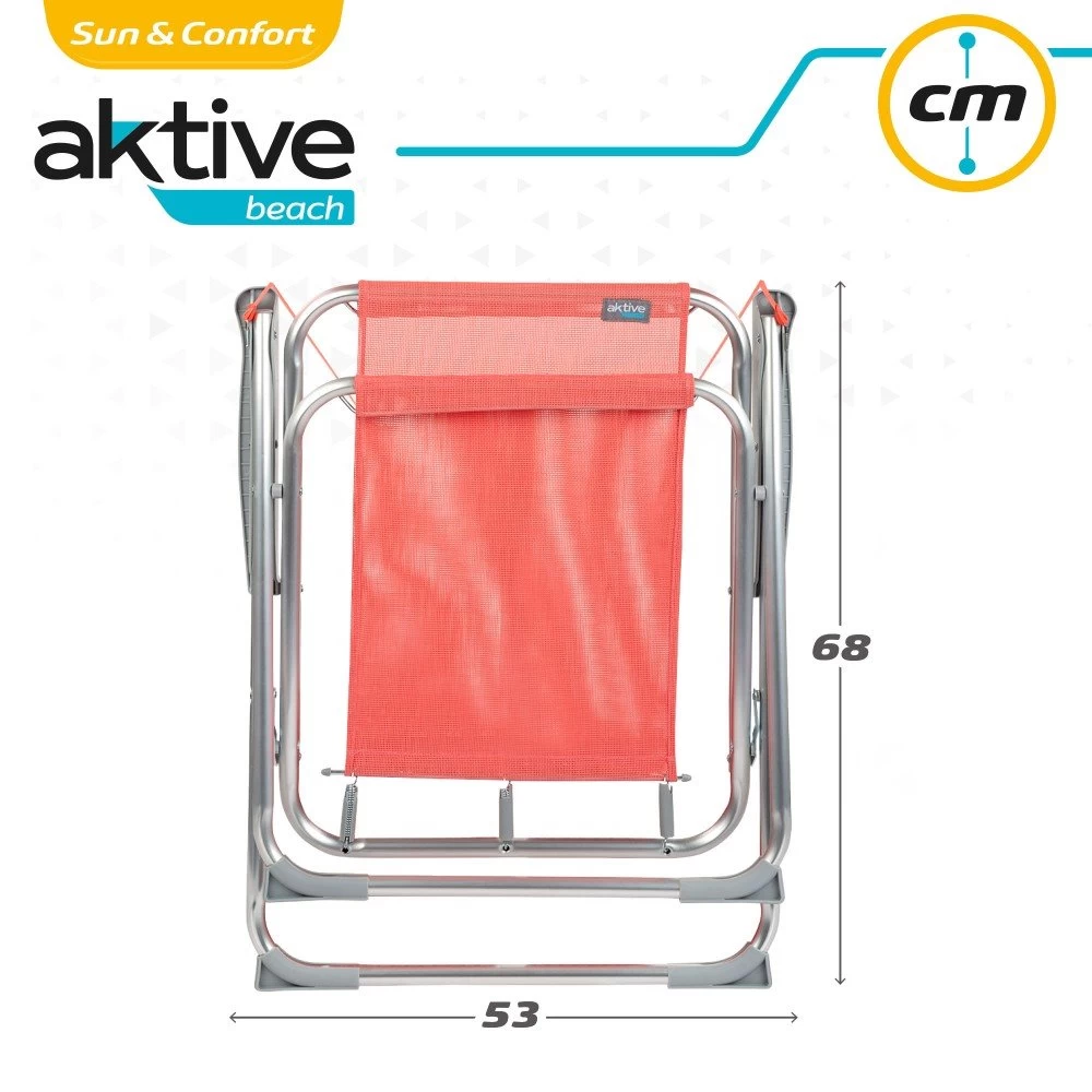 Silla alta con posición fija plegable Aktive Beach en color coral y medidas 44 x 45 x 76 cm. Altura asiento: 39 cm. Fabricada con estructura de aluminio resistente y asiento de textileno impermeable, lavable y resistente a la intemperie, soporta un peso máximo de 100 kg. Se pliega con facilidad e incorpora asa de transporte para trasladar con comodidad. Esta silla plegable alta es ideal para la playa o para ir de camping.