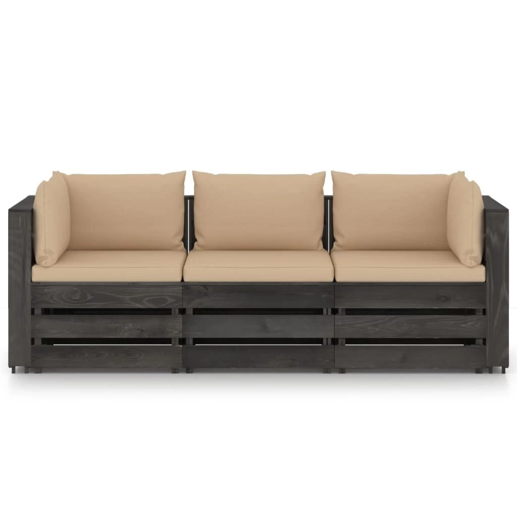 Este sofá de jardín de 3 plazas es una opción ideal para relajarte y disfrutar del buen tiempo, echar una siesta o charlar con tu familia o amigos. Con un diseño de palés atemporal, el sofá de madera agregará un toque de encanto rústico a tu patio, jardín o sala de estar. Hecho de madera de pino impregnada, el sofá de palés es duradero, resistente a la intemperie y respetuoso con el medio ambiente. Este sofá de exterior tiene una estructura maciza y requiere poco mantenimiento. Con cojines blandos y bien acolchados (no incluidos, el asiento de jardín te brinda la máxima comodidad. Nota: Para prolongar la vida útil de los muebles de exterior, te recomendamos que los limpies con regularidad y no los dejes al aire libre sin protección innecesariamente.Limpieza: Usa una solución de jabón suave.Almacenamiento: Si es posible, guarda el producto en un lugar fresco y seco en el interior. Si el producto se almacena al aire libre, protégelo con una funda impermeable. Limpia y seca el exceso de agua o nieve de las superficies planas después de una lluvia o nevada. Permite la ventilación para evitar daños relacionados con la humedad. Color de cojín: BeigeMaterial: Madera de pino impregnada de grisMaterial del cojín: Tela (100% poliésterDimensiones de sofá esquinero: 69 x 70 x 66 cm (ancho x profundo x altoDimensiones del sofá central: 60 x 70 x 66 cm (ancho x profundo x altoGrosor del cojín del asiento: 6 cmGrosor del cojín del respaldo/lateral: 13 cmRequiere montaje: SíLa entrega incluye:1 x Sofá central2 x Sofás de esquina3 x Cojines de asiento5 x Cojines de respaldo/laterales