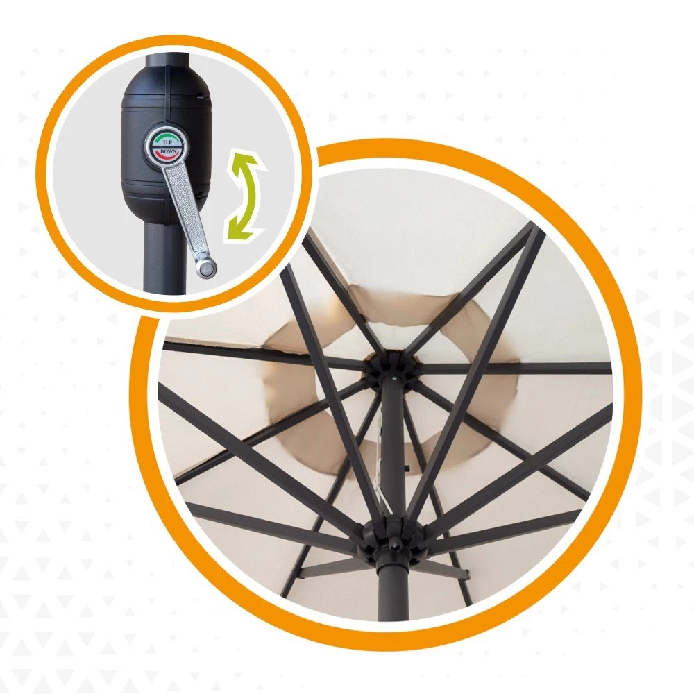 - Extras: protección UV50 y sistema de manivela para abrir y cerrar el parasol