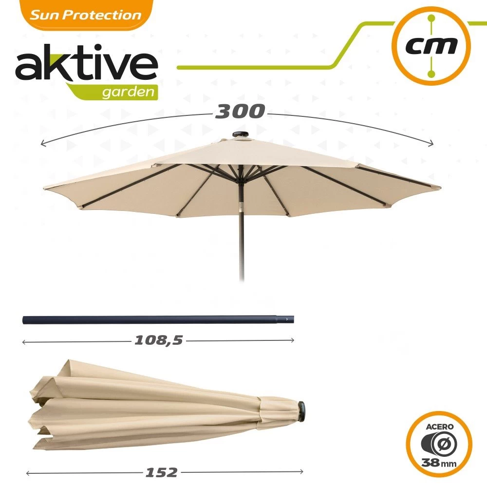 Sombrilla terraza con luces LED solares de Aktive Garden ideal para colocar en el jardín o la terraza y usar tanto por el día como por la noche. La sombrilla tiene formato octogonal, es de color crema, su material es poliéster de 160 gr y tiene protección UV50+ que protege frente los rayos del sol. El diámetro de la sombrilla es de 300 cm y el de su mástil fabricado de acero de 38 mm. El mástil lleva incorporada una manivela manual para abrir y cerrar la sombrilla cómodamente y botón para encender o apagar las 32 luces LED que se encuentran repartidas por las 8 varillas de aluminio y que se cargan mediante el sistema de carga solar situado en la parte superior. Además, el mástil es inclinable para adaptar la sombrilla a la posición del sol y el techo es de tipo chimenea, perfecto para favorecer la circulación del aire y hacerla más estable en días de viento suave.