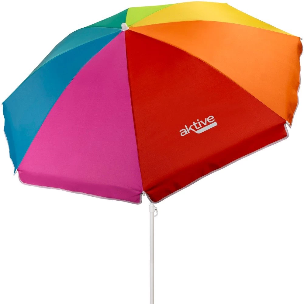 Sombrilla de playa con arco de 180 cm y mástil de 22-25 mm con altura regulable. La sombrilla está fabricada con material de poliéster con panales de colores diferentes (amarillo, naranja, rojo, rosa, azul, turquesa, verde y lima y protección UV50 con revestimiento interior plateado. La estructura de aluminio está formada por 8 varillas de fibra de vidrio que sujetan el toldo y un palo flexible para orientar la sombra. La sombrilla incluye bolsa de almacenamiento para transportar con asa.