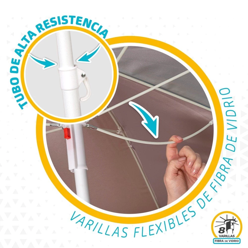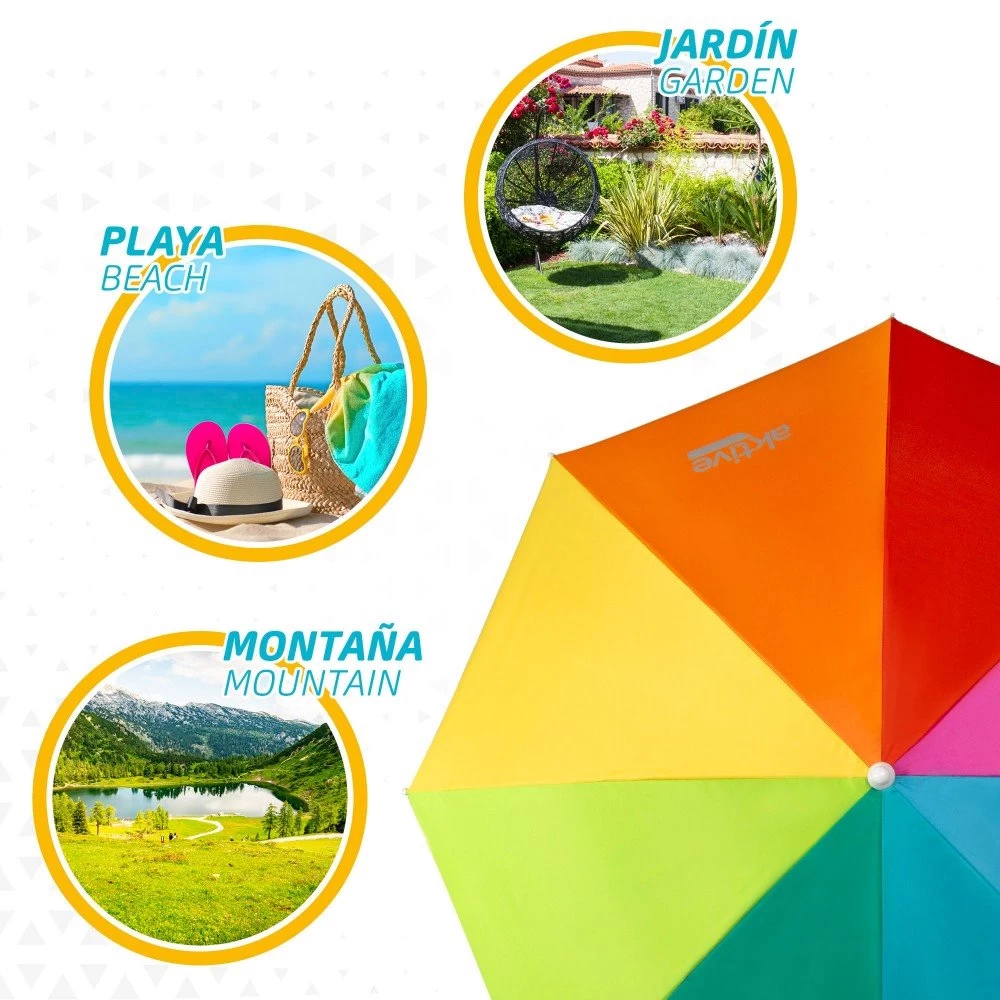 - Multicolor: fabricado con material poliéster de gran calidad y paneles de colores, con 8 varillas de fibra de vidrio y palo flexible para orientar la sombra