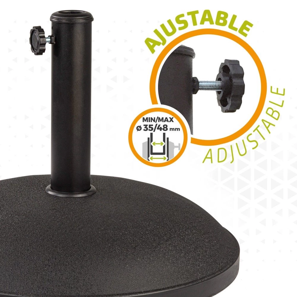 Soporte para sombrilla Aktive Garden en cemento con 4 ruedas con freno y medidas de 50 cm de diámetro y 38 cm de alto. La pieza pesa 25 kilos. El diseño es funcional e incluye tubo de acero para anclar el mástil apto para sombrillas con mástil de 35 y 48 mm, con rosca estable. Los materiales son resistentes al agua y al sol. Ideal para asegurar la estabilidad y sujeción de tu sombrilla frente al viento.