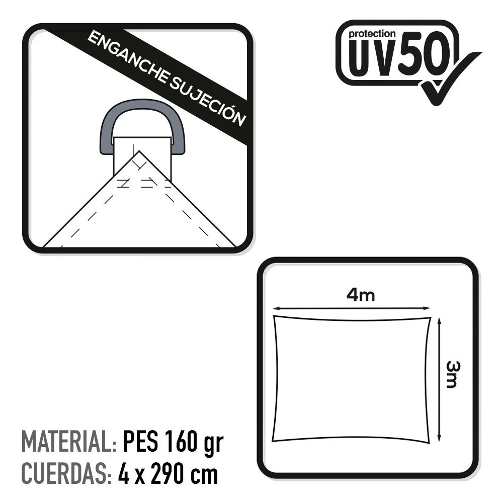 Toldo cuadrado modelo Sombreo en color blanco de Aktive Garden. Las dimensiones del toldo son 300×400 cm. Fabricado en poliéster de 160 gr/m2 y con protección solar UV50. Las esquinas del toldo están reforzadas y cuentan con enganches para su sujeción. Al no necesitar estructura, el toldo se puede colocar a cualquier altura y sujetarlo donde se prefiera. Decora tus exteriores con Aktive.