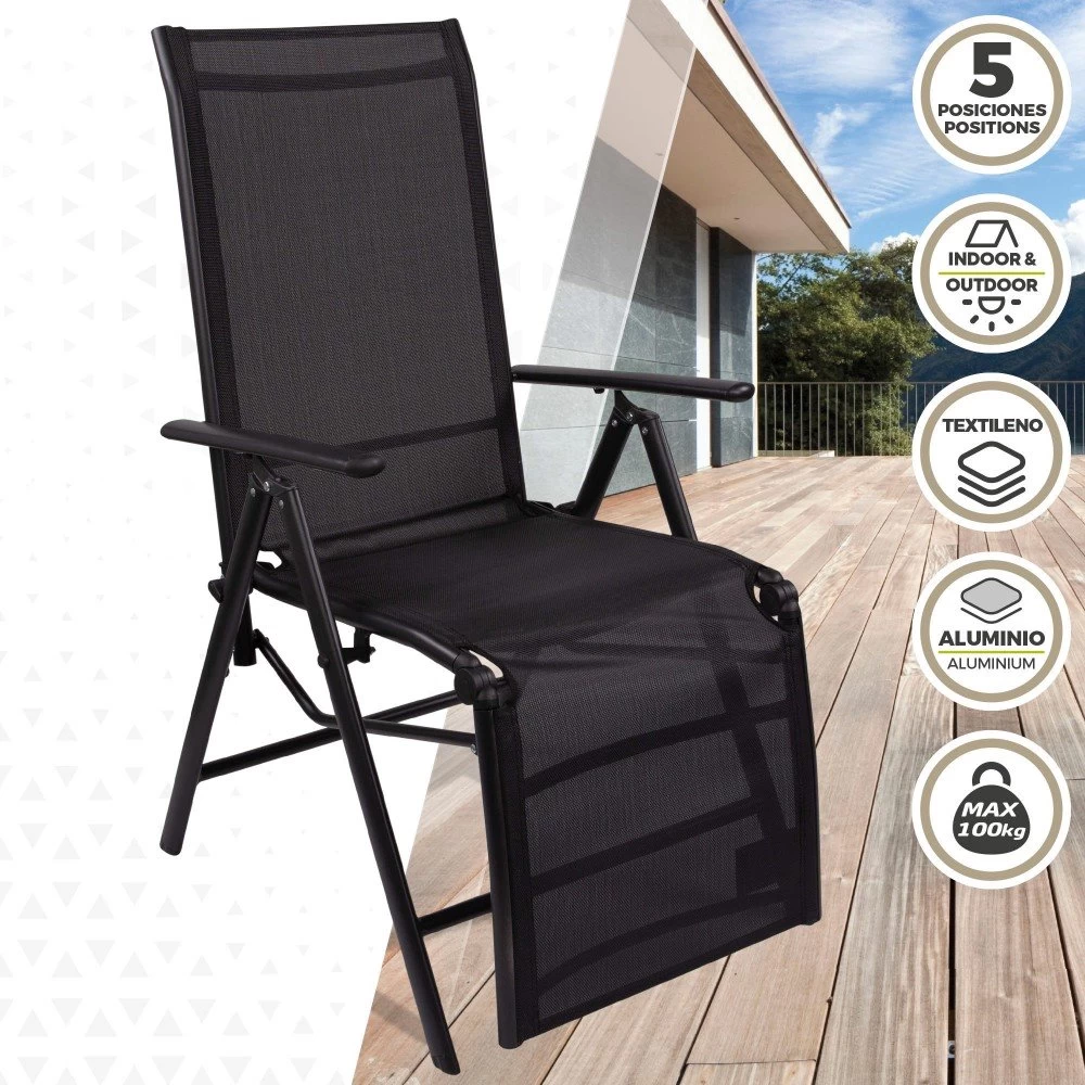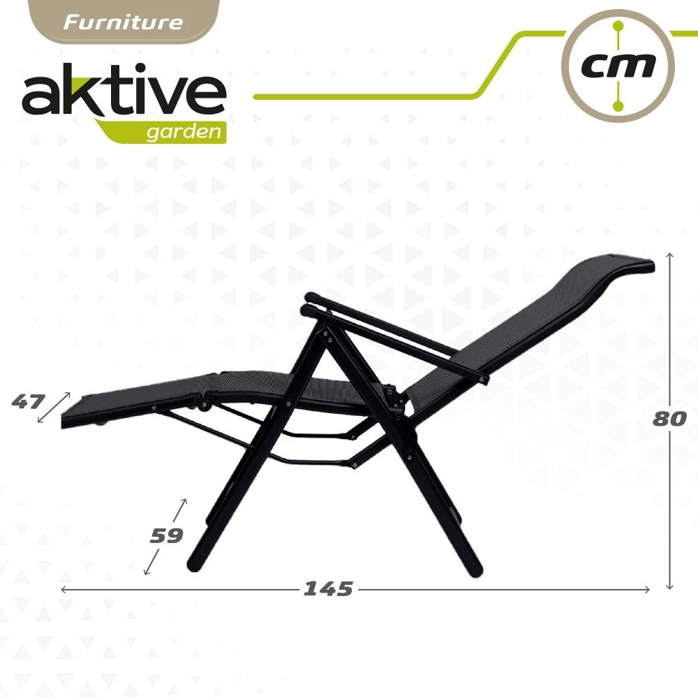 Tumbona plegable para jardín Aktive Garden con medidas 65x53x103 cm. Tumbona fabricada con aluminio recubierto en polvo con tejido de textileno en color negro, con protección solar y repelente al agua. El respaldo y el reposapiés son reclinables con reposabrazos ergonómicos regulables en función de la inclinación del respaldo. Soporta un peso máximo de 100 kg. ¡Disfruta de un asiento cómodo con Aktive Garden!